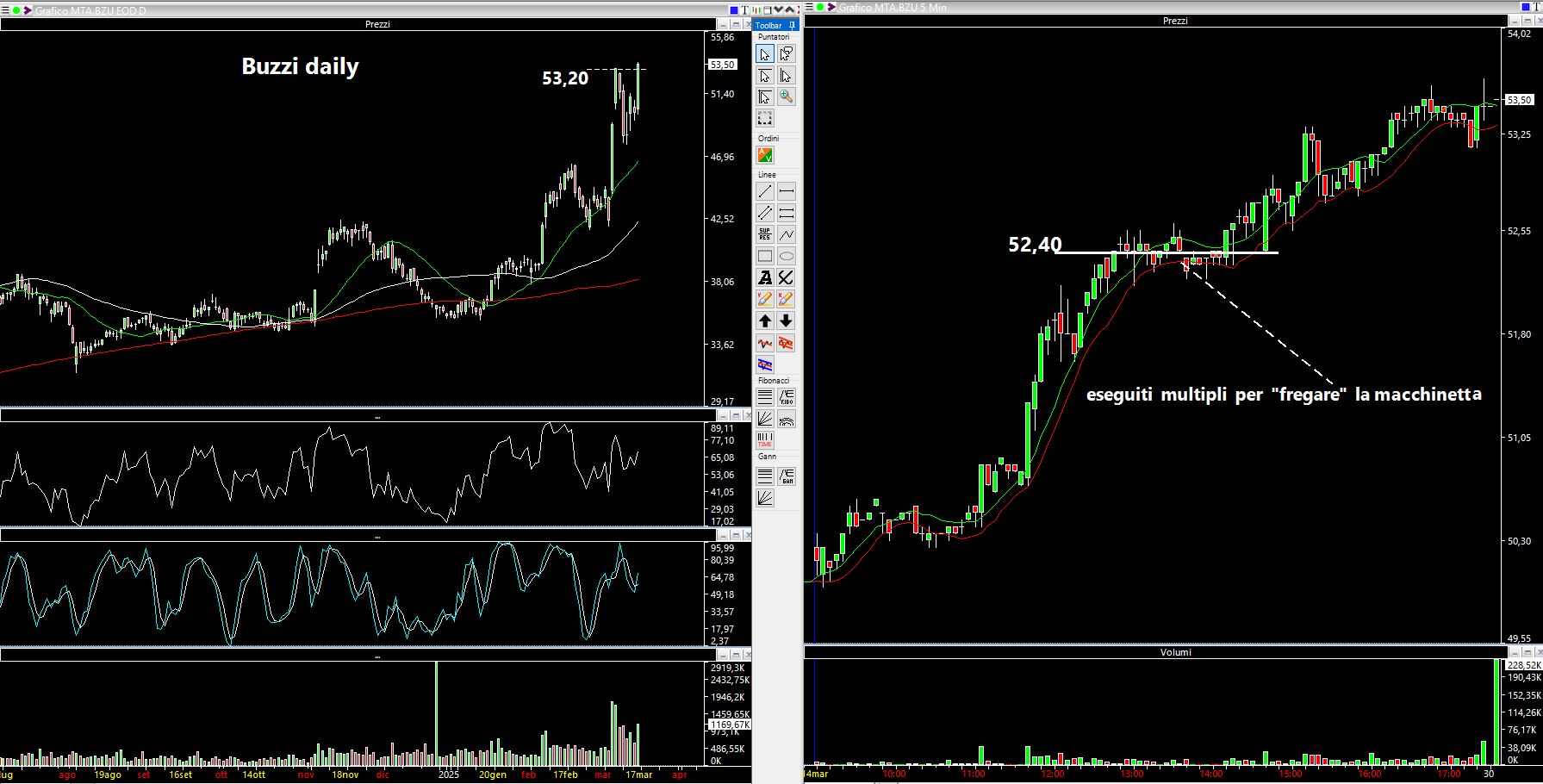 In un mercato di questo tipo l'unica soluzione al momento credo che sia quella di trovare un titolo che si dimostri forte nel durante e poi entrare nella seconda fase della giornata dopo che si sono evitati i vari swing. A titolo di esempio, sempre prendendo ad esempio la seduta di venerdì, ho notato che Buzzi si stava comportando bene con un trend tutto sommato abbastanza regolare e lineare anche se c'era una macchinetta che immetteva e toglieva i primi due livelli di bid e di ask giusto per indurre qualcuno a vendere o a comprare. Dopo aver visto che il titolo si comportava bene ho deciso di assumere una posizione long attorno a 52,40 euro dove aveva creato una sorta di rettangolo quindi con uno stop relativamente stretto (0.3-0.5 euro per intenderci). Sul daily un'area target poteva essere attorno a 53,20, i recenti massimi della settimana scorsa. Dopo l'entrata in posizione ho mano a mano smezzato: dei 600 pezzi iniziali presi a 52,40 con eseguito multiplo per fregare il software, 200 sono andati a 52,60, altri 400 a 52,80....ne rimanevano dunque 200 pezzi e quindi teoricamente il trade poteva essere lasciato correre. Ho poi venduto 100 pezzi in corrispondenza del livello daily indicato in precedenza (52,25..di solito le macchinette fanno rompere un livello e poi fanno ritracciare di qualche tick....ma in questi casi il mio canale di media di colore rosso e verde non sbaglia quasi mai). Le ultime 100 azioni sono state "favorite" MOC@53,50 con un profit di 395 euro sul singolo trade. Certo, stando a vedere il grafico avrei dovuto andare overnight...ma vatti a fidare con Trump!!! Quasi certamente l'open di lunedì sarà più alto o favorirà uno strappo iniziale ma ho deciso di accontentarmi, quindi va bene così.