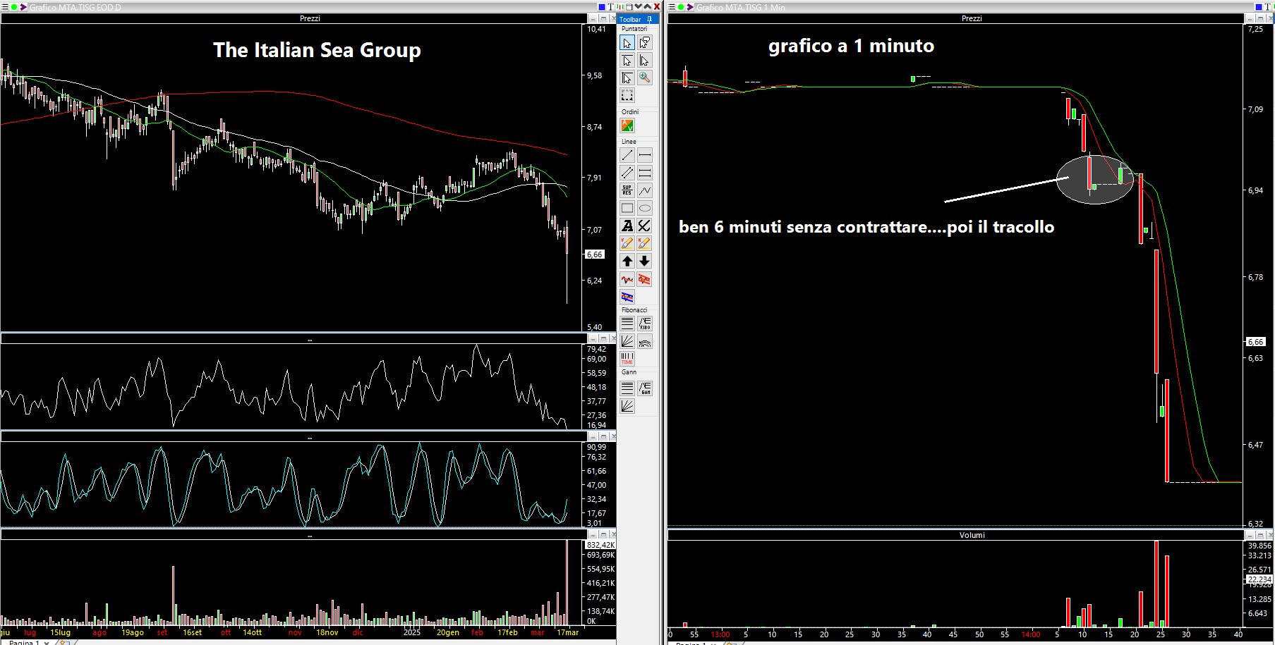 Memore di quanto visto in precedenza, nella seduta di venerdì sono usciti i dati di TISG (The Italian Sea Group) che non mi sono piaciuti. Ne ho shortate una manciata a titolo di scommessa al prezzo di 7 euro. Dopo l'ingresso l'azione è praticamente stata ferma dalle ore 14.11 alle ore 14.17: ben sei minuti !!! Temendo la possibile ennesima fregatura di giornata ho chiuso in pari il trade. Tempo altri tre minuti e l'azione è TRACOLLATA del 15% da 7 euro a 5,86 salvo poi recuperare nel finale. Un vero e proprio smacco per il sottoscritto! Non vi nascondo il nervoso...ma questo è un mercato che "ti tira matto" in intraday! Di seguito il grafico daily a sinaistra e a un minuto a destra con il relativo eseguito.