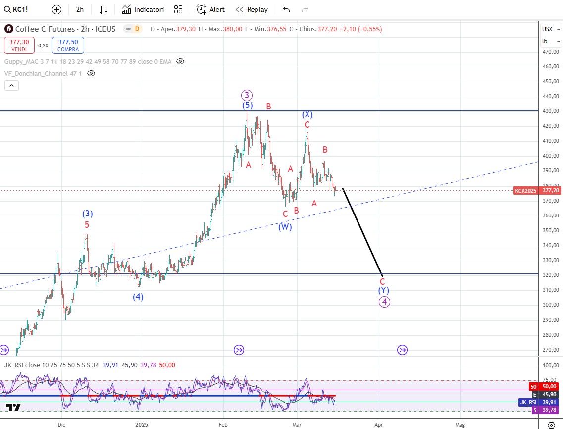 Il caffè sta sviluppando un secondo zigzag che porterà a concludere l’onda [4] di grado primario. Le onda A e B di (Y) sono già concluse ed è in corso l’onda C Da seguire.