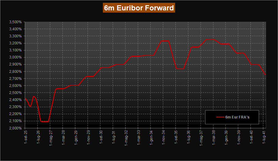 Infine, il tasso forward Euribor a 6 mesi si posiziona al 2,09%, indicando che il mercato si aspetta condizioni monetarie meno accomodanti, con un possibile scenario di rialzo graduale dei tassi d’interesse nel breve e medio termine.