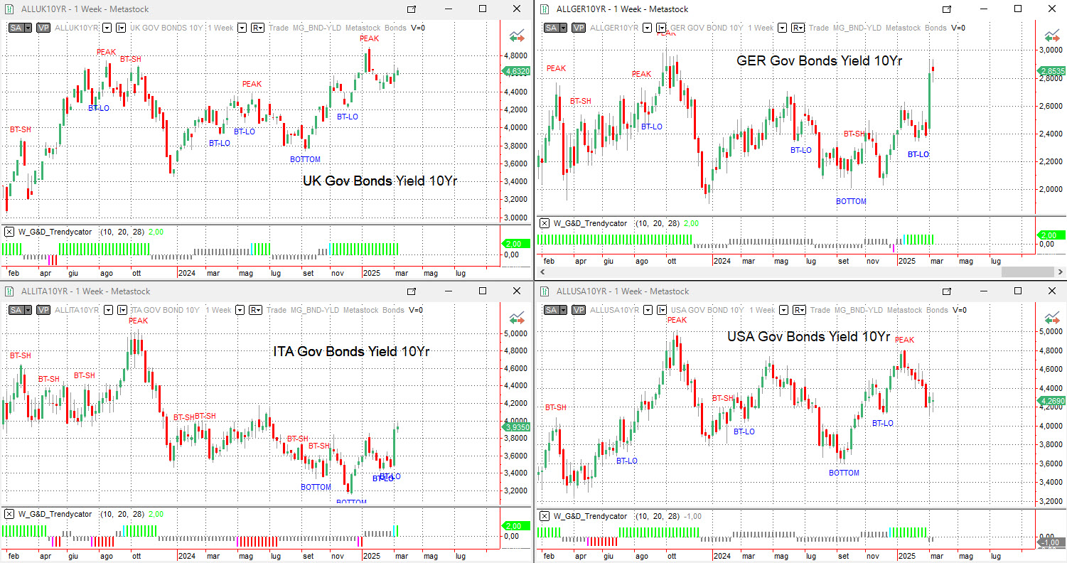 Nel Regno Unito, il rendimento dei Gilt decennali si è stabilizzato in area 4,63%, mantenendo comunque un trend positivo. Il Trendycator resta LONG, indicando che la struttura rialzista di fondo permane robusta nonostante il lieve ritracciamento settimanale.