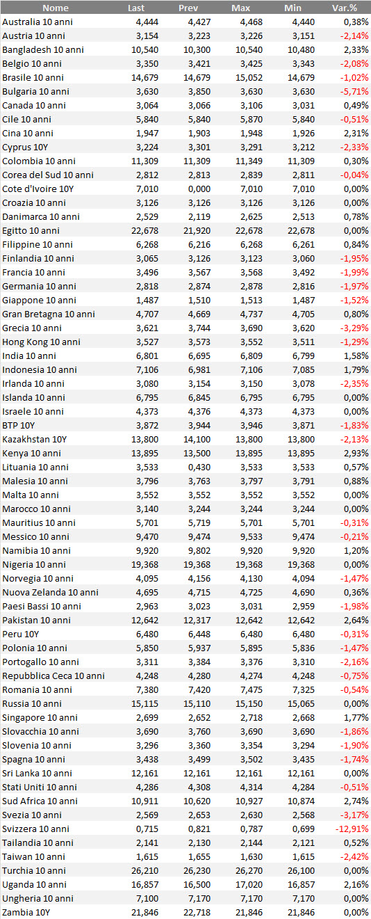 Rendimenti bond governativi benchmark mondiali