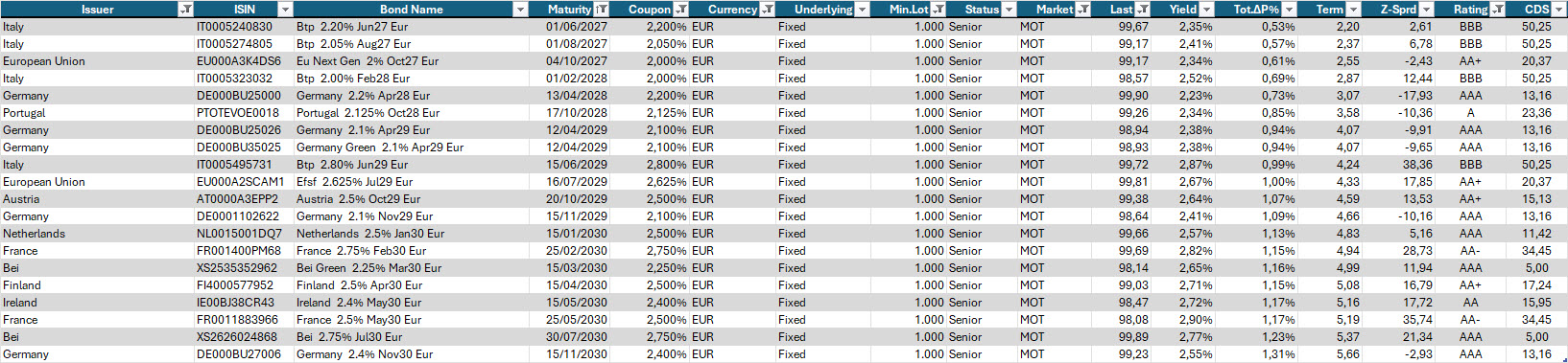 Qui sotto, a titolo di esempio, una selezione di governativi con scadenze da 2 a 5 anni, con cedola non inferiore al 2% e prezzo inferiore a 100.