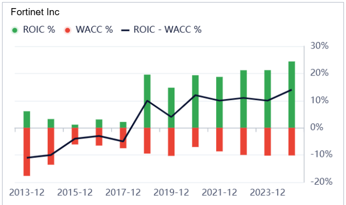 L’interest coverage TTM (trailing twelve months) di Fortinet è di 90,17. Il dato mediano del settore dei software è di 27,99.