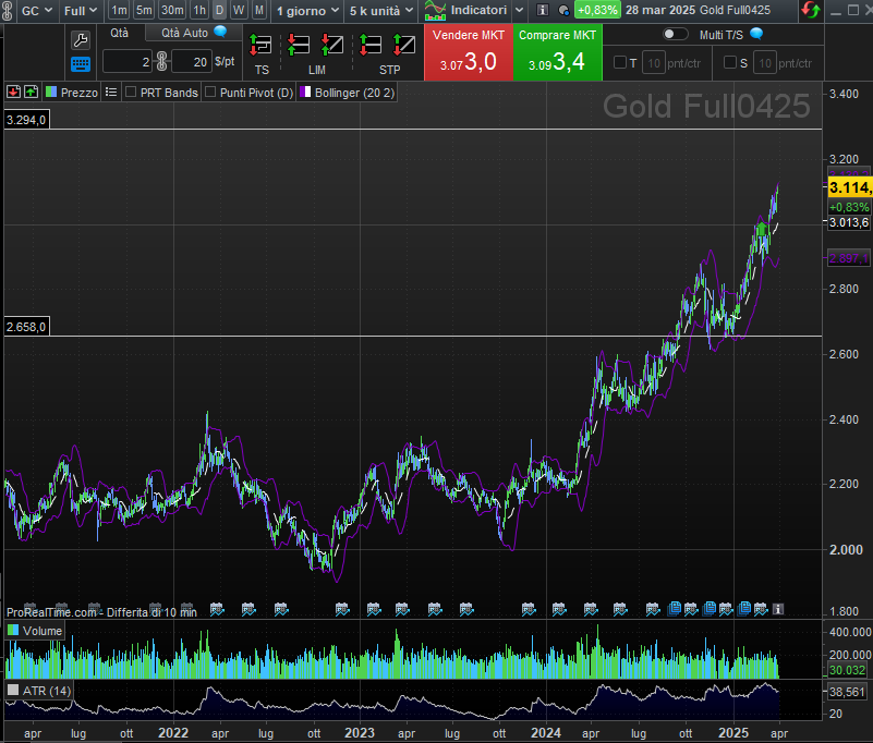 L’oro, intanto, vola a 3.085$/oncia, alimentato dalle tensioni geopolitiche (Ucraina, Filippine-Cina-Usa e Medio Oriente su tutte) e dal dollaro in affanno. Tecnicamente, è il momento della verità: o correzione verso i 2.700$ o sprint verso i 3.300$. La seconda ipotesi è plausibile se le banche centrali accelereranno gli acquisti per proteggersi dal caos valutario.