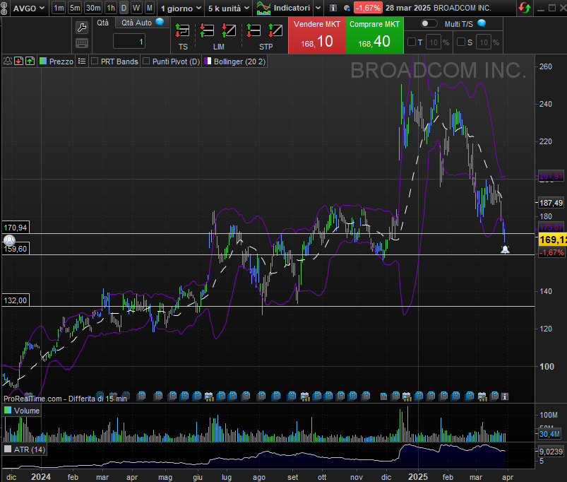 Broadcom (AVGO), citata uno dei termometri del settore tech, è osservata speciale: i 160$ sono un livello di switch tra rimbalzo tecnico e caduta libera verso i 132$. Consiglio: stop loss obbligatori, e non fidarsi del solito "buy the dip".