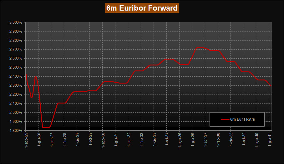 Infine, i tassi forward indicano una lieve flessione dell’Euribor a 6 mesi, che si attesta ora all’1,84%, ben più in basso delle stime del 2% riferite al tasso neutrale. Questo movimento, probabilmente, più che riaccendere concretamente le aspettative di un ciclo di tagli BCE più incisivo, potrebbe essere semplicemente influenzato dall’eccessiva instabilità del tratto breve della curva, al netto di eventuali dati macro non ancora a noi noti sul fronte della crescita economica.