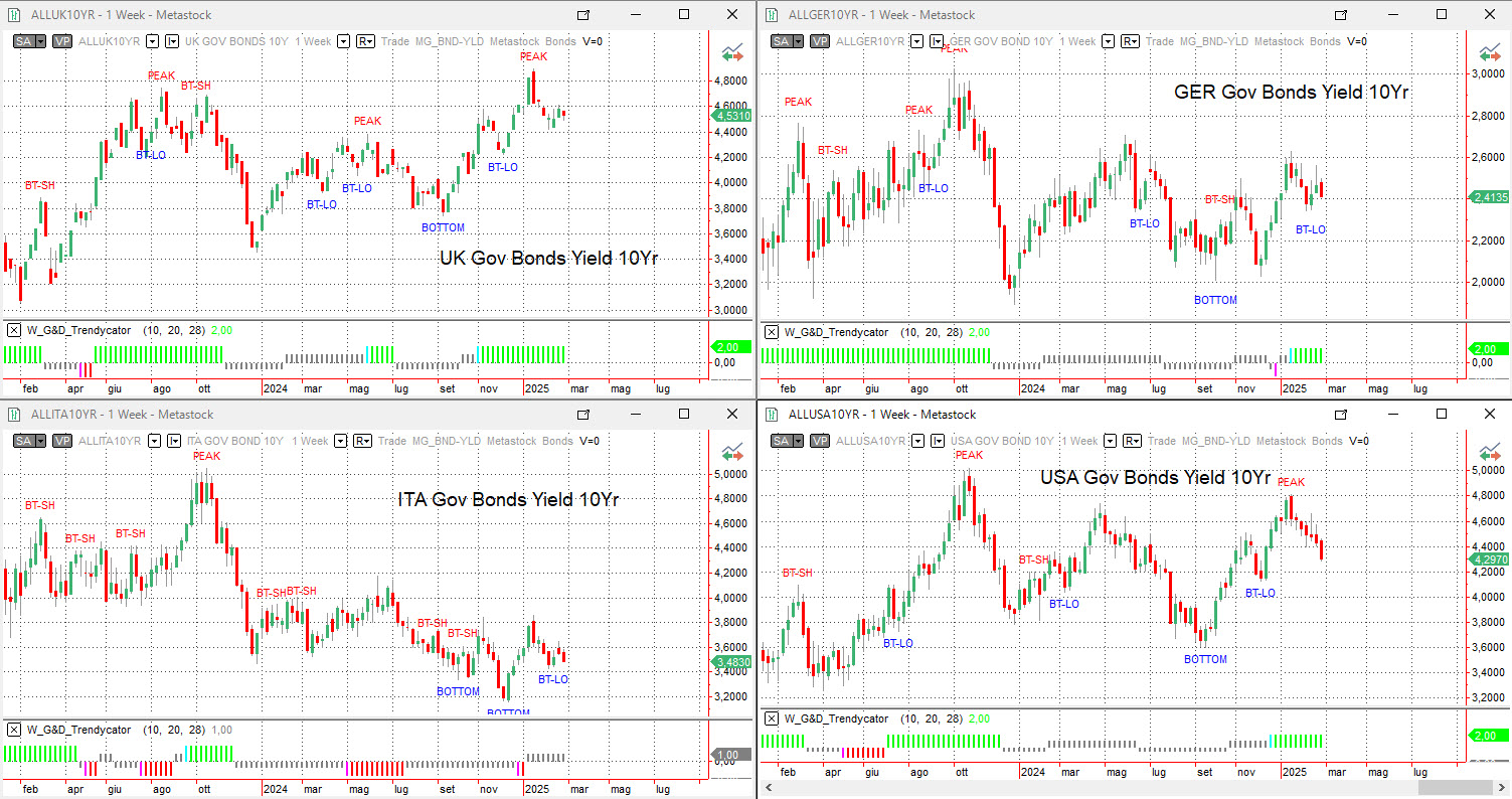 In Germania, il rendimento del Bund decennale ha registrato una flessione al 2,41%, confermando un rallentamento nel movimento rialzista delle scorse settimane. Il Trendycator resta LONG, indicando che, sebbene il trend sia ancora positivo, il mercato sta incorporando aspettative più caute sulla direzione futura della BCE.