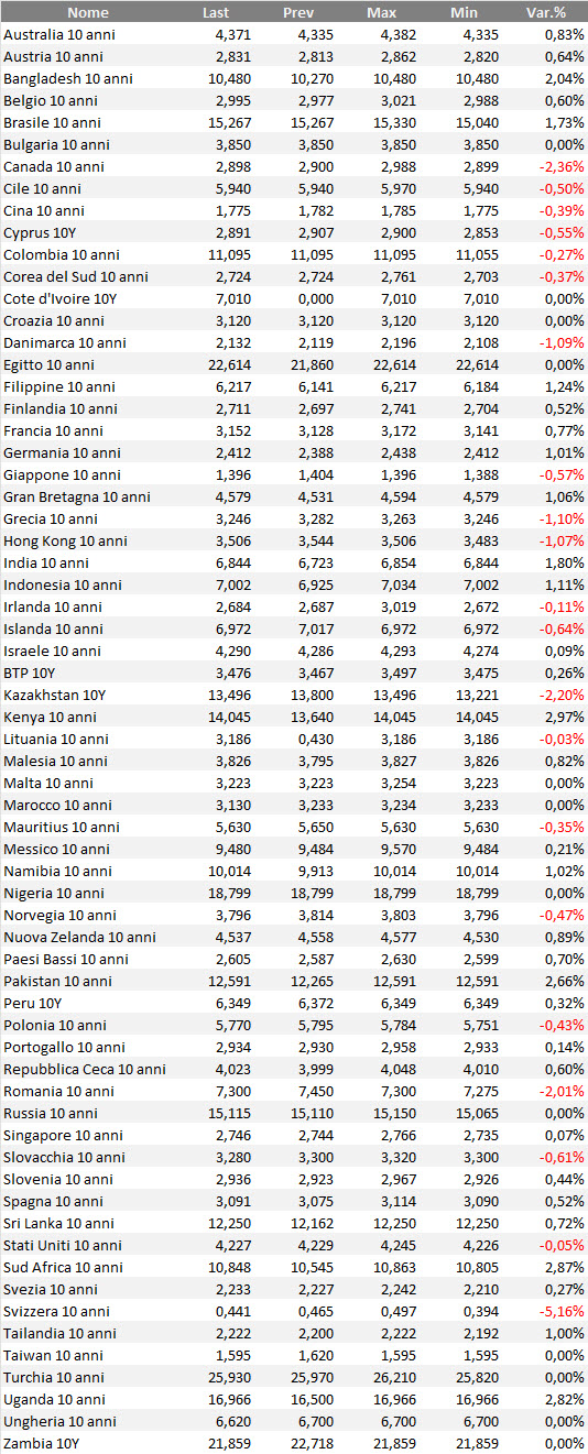 Rendimenti bond governativi benchmark mondiali