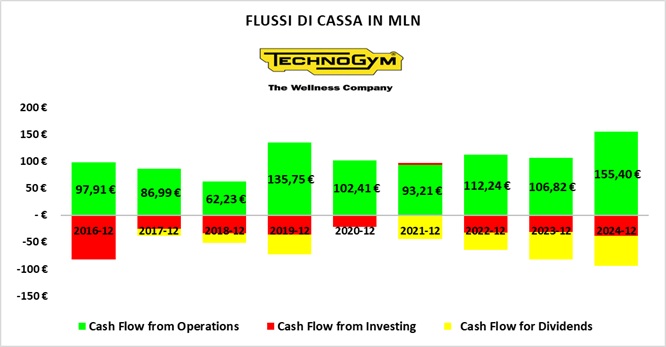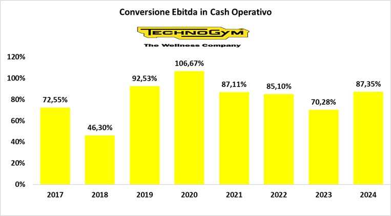 Technogym conferma la propria capacità di generare cassa, con un Cash flow operativo pari a 155 milioni di euro, in crescita rispetto ai 106,82 milioni del 2023.