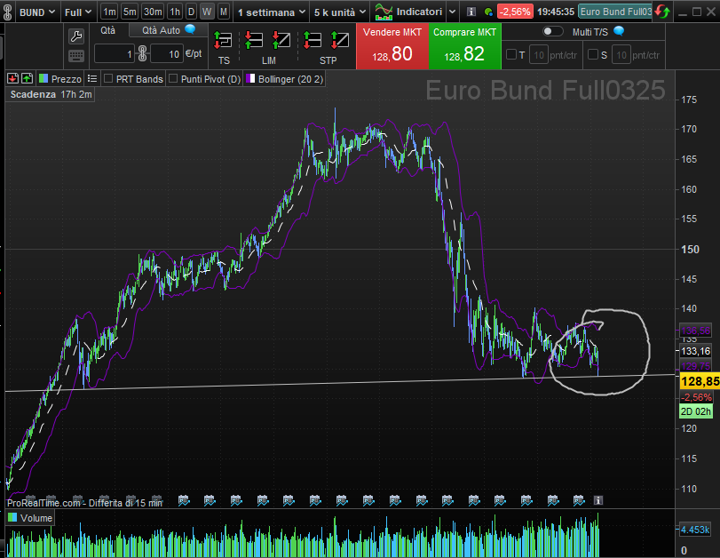 Il future in scadenza giugno 2025 ha chiuso oggi a 127,93 punti (sul livello Pivot di S2), mentre il vecchio contratto marzo (in chiusura domani 6 marzo) viaggia a 128,8 quindi trascinandosi una differenza di circa 110 tick.