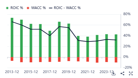 La tabella è ordinata per la differenza ROIC – WACC e abbiamo selezionato in rosso 4 azioni che hanno: