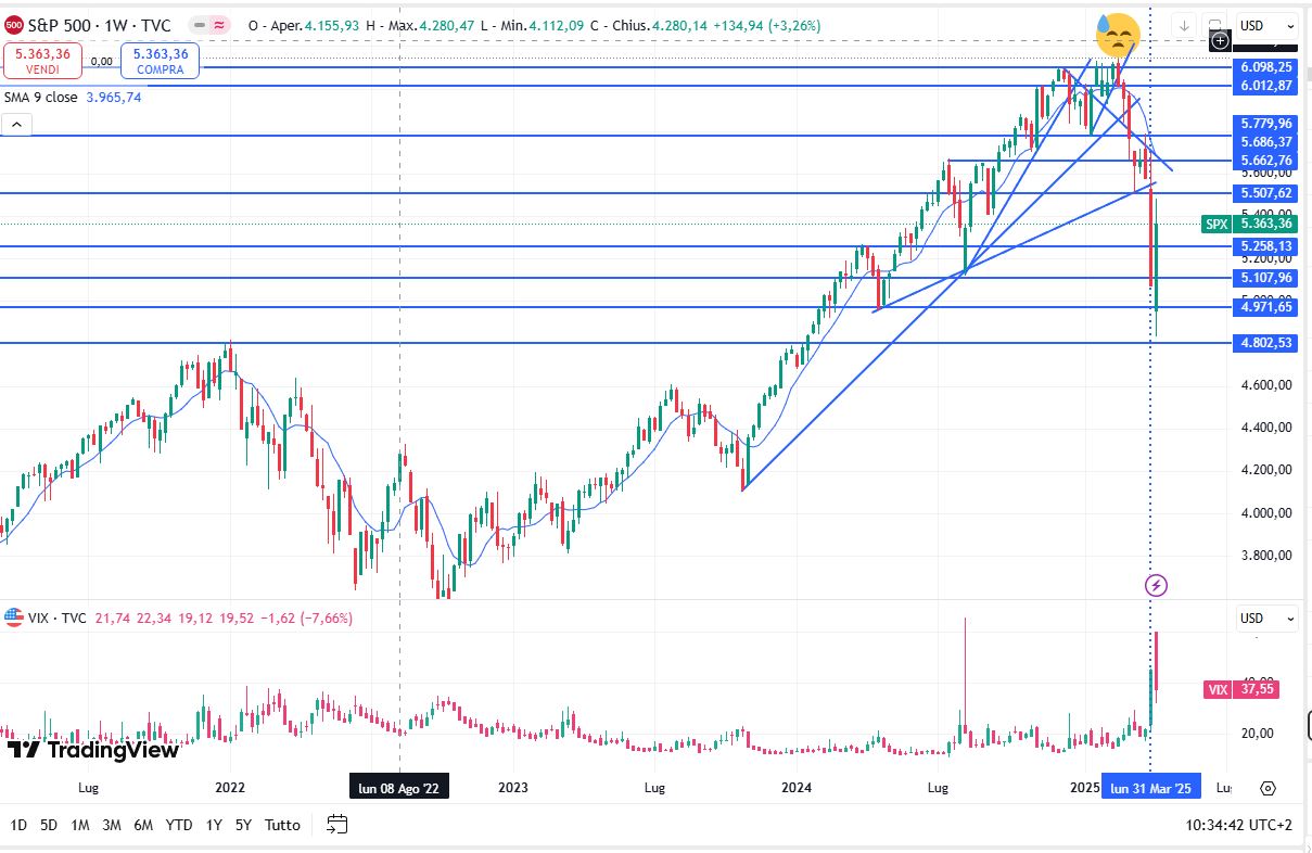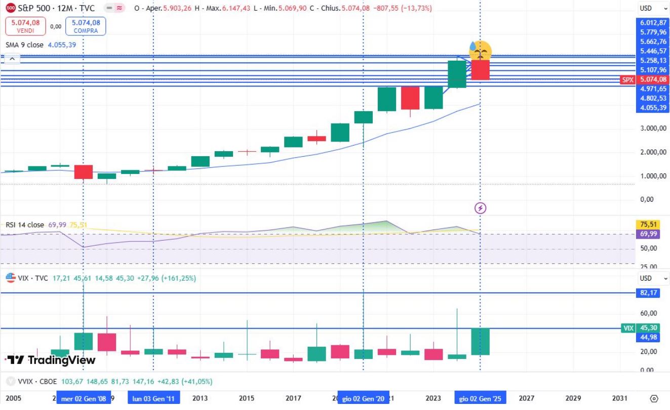 Sabato scorso, con un grafico annuale, avevo mostrato come l'S&P500 pur essendo in caduta libera stesse per andare a toccare i massimi del 2021, del 2022 ed i minimi del 2024 (link articolo: https://www.lombardreport.com/2025/4/10/s-p500-indice-ftsemib40/) e così è poi stato e da quel punto abbiamo assistito ad un forte rimbalzo. Questo il grafico ANNUALE della settimana scorsa (nessuna linea è stata modificata)