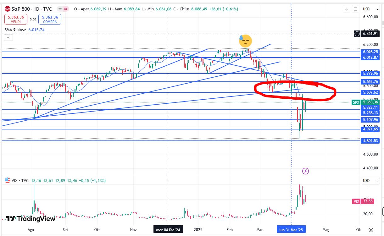 Ma andiamo subito all'analisi grafica degli indici. Nel mio breve update di giovedì (link articolo: https://www.lombardreport.com/2025/4/10/s-p500-indice-ftsemib40/) mostravo un pò di timore per la brutta candela che si stava creando anche se nulla era ancora compromesso. I mercati infatti si stavano "rimangiando" buona parte della candela rialzista appena formata. Sono stato smentito nella giornata di ieri, quando dalle 17.30-18.00 ora italiana l'S&P500 è risalito a razzo, complici le dichiarazioni della FED pronta ad intervenire per stabilizzare il quadro generale e le nuove dichiarazioni di Trump che spera in un qualche accordo con i partner cinesi. Staremo a vedere: capite meglio di me che si vive alla giornata.