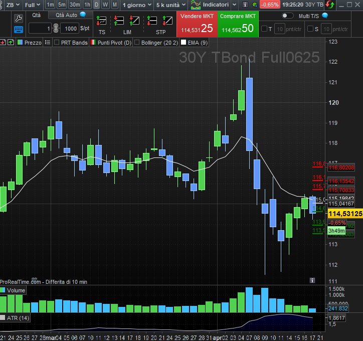 Il T-Bond 30Y naviga ancora attorno ai prezzi della scorsa settimana (114.5 punti), segno che gli investitori attendono prove concrete di coerenza politica.