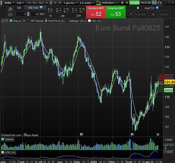 Bund europeo : In recupero dai minimi di marzo, quota in chiusura 131.70 con target a 132 (rottura) per confermare un trend rialzista e addirittura con la possibilità di strappare al rialzo oltre 132.7.