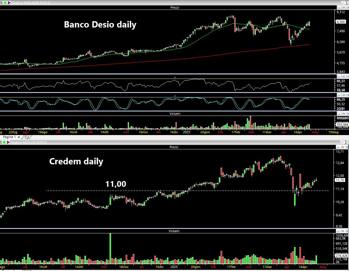Abbiamo poi un titolo bancario come Banco Desio impostato molto bene ma che lunedì staccherà un dividendo di 0,4566 euro che nelle sedute successive potrebbe velocemente ricoprire lo stacco vista la forza del settore. poi Credem che ha chiuso l'ottava a 11,70 ma che potrebbe ritrovare la forza per continuare nel trend rialzista a condizione che venga mantenuta l'area degli 11 euro.