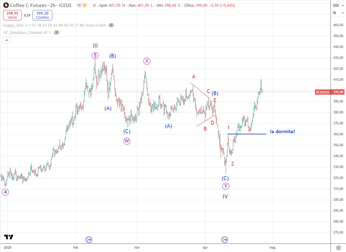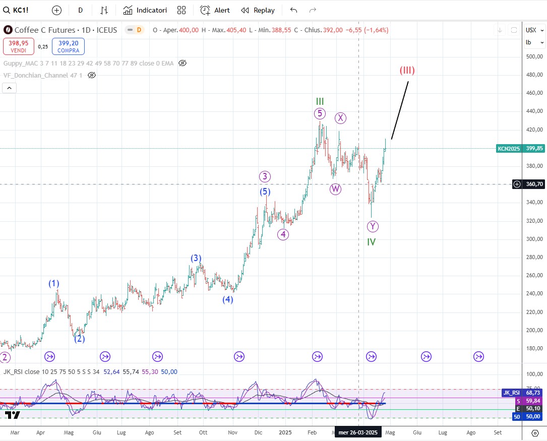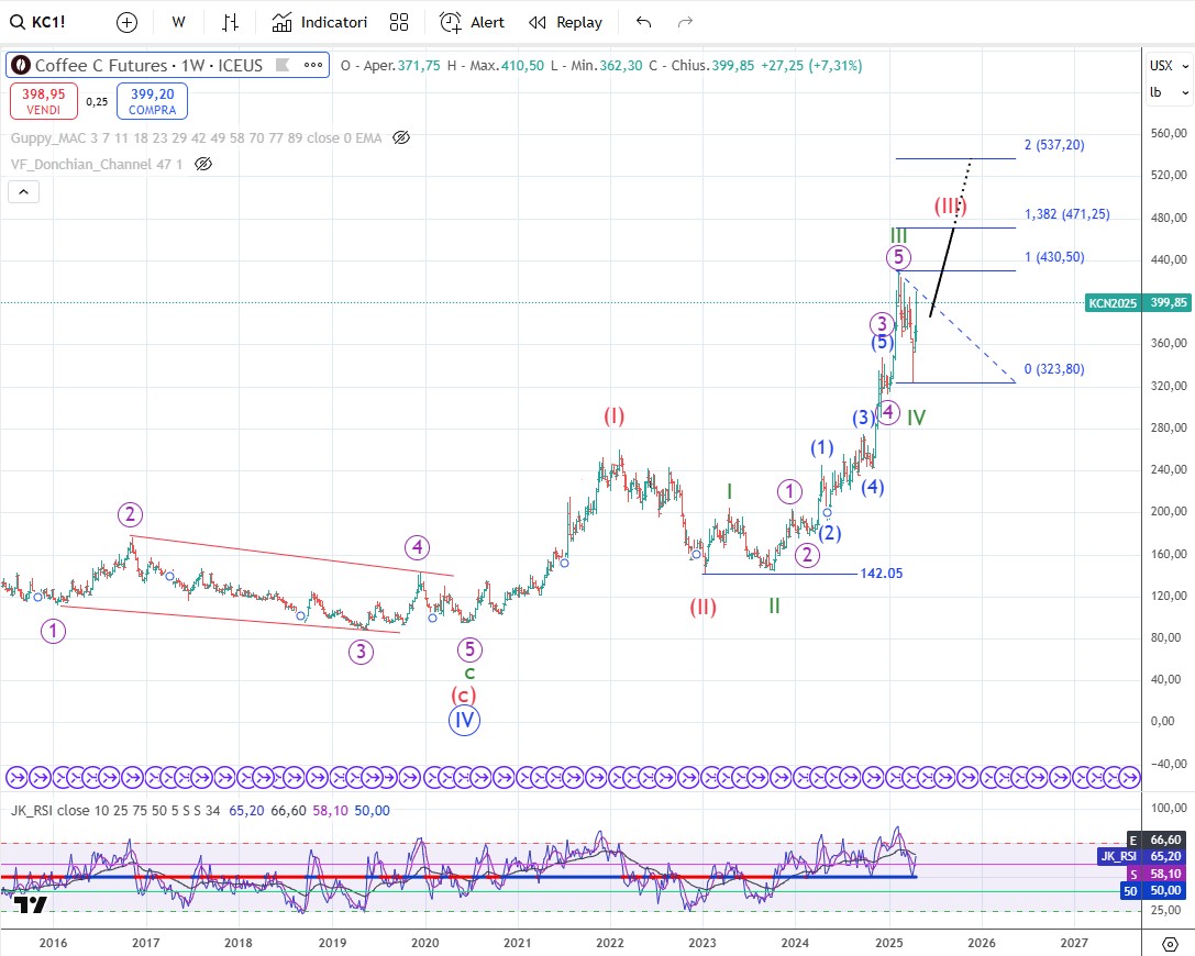 Sul grano dall’ultimo report è proseguito lo sviluppo dell’ending diagonal con il completamento dell’onda (4) e inizio dell’onda (5) che dovrebbe essere ormai a metà percorso. Una volta che il modello sarà concluso apriremo posizioni long.
