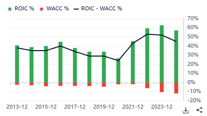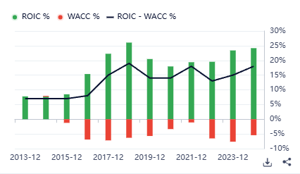 Per chi vuole tagliare la testa al toro postiamo di seguito il grafico ROIC – WACC che è qualcosa di lunare: come spiego ad ogni piè sospinto questo indicatore mostra la redditività dell’attivo (reddito operativo / totale attivo) rispetto al costo del capitale azionario. Notate soprattutto come ci sia quella cosa che piace a Buffet: la stabilità anno dopo anno. E le percentuali di rendimento sono assolutamente lunari (+40%).