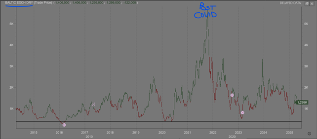 Nulla che vedere con il restocking post covid in cui il costo dei trasporti marittimi ebbe un impennata importante ma potrebbe fare tornare l'attenzione sui titoli del settore (vedasi il Grafico Baltic Dry index), un indice che comunque non ha avuto un calo significativo nonostante la battaglia sui dazi.