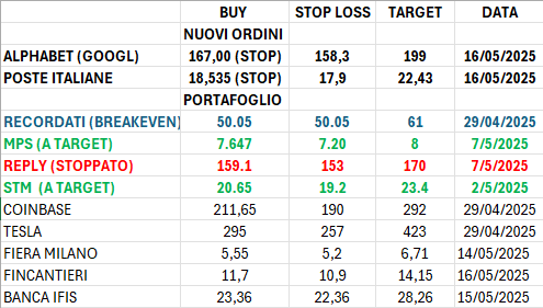 ALPHABET: entriamo in acquisto, situazione di bottom up evidente, con uncino che ci sorride, rischio minimo upside potenziale enorme. Buy 167.00 stop, stop loss 158,30, target 199.00