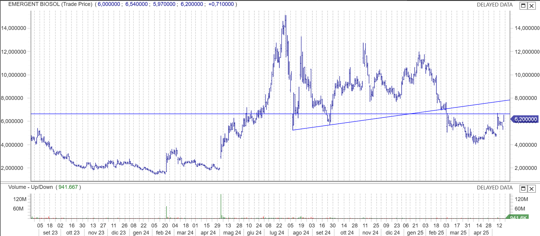 EBS – Dopo mesi di forza relativa negativa da dieci giorni pare dare segnali di risveglio su questo fronte anche graficamente pare disegnare un bel testa e spalle rialzista.