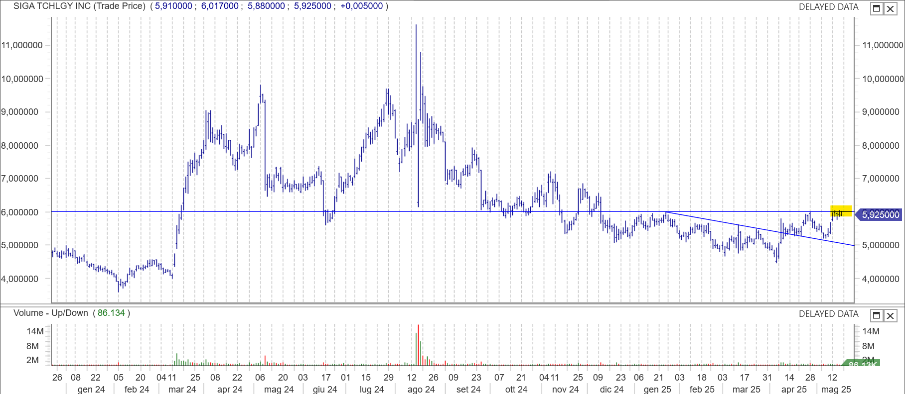 SIGA - Dopo la rottura della trend line discendente stazione sotto la resistenza statica di 6usd. Interessante la violazione a rialzo di tale livello.