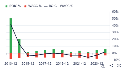CAIRO: nota società di advertising con un Piotroski di 8 su 9 (molto buono), un interest coverage di 11.99, Debt to equity di 0.19 da la lato patrimoniale. Dal lato reddituale abbiamo un tasso medio composto di crescita degli EPS di 3.7, un margine operativo sul fatturato del 10.27% e purtroppo un ROIC – WACC deludente come da immagine seguente: