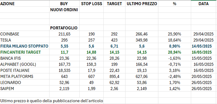 “Ti piaceresse essere ancora dentro Fincantieri ... !” così un vecchio lettore mi ha apostrofato dopo avere aggiornato lo stop profit su Fincantieri e aprendo la strada ad altri 100 lettori che me l’hanno fatto notare. In realtà su Fincantieri eravamo andati a target qualche giorno prima. Ma che volete che vi dica, sono avido e del resto che direttore di un giornale per speculatori sarei se non lo fossi ?