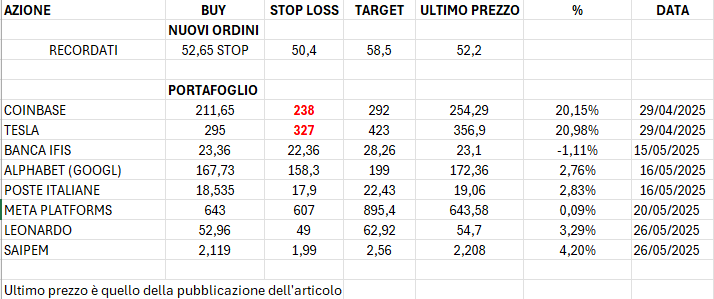 Aggiorniamo il portafoglio con due stop loss su Coinbase e su Tesla che diventano stop profit, vuoi mai vedere che ... lo scopo è quello di fare una operazione che vada avanti delle settimane correndo il rischio di restituire al mercato un po' del profitto.