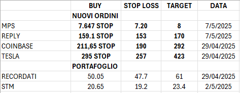Sul mercato azionario USA abbiamo sempre due ordini buy su Tesla e Coinbase. Su Tesla ci stiamo raffreddando molto e se non arriva il breakout in fretta cancelliamo l’ordine.