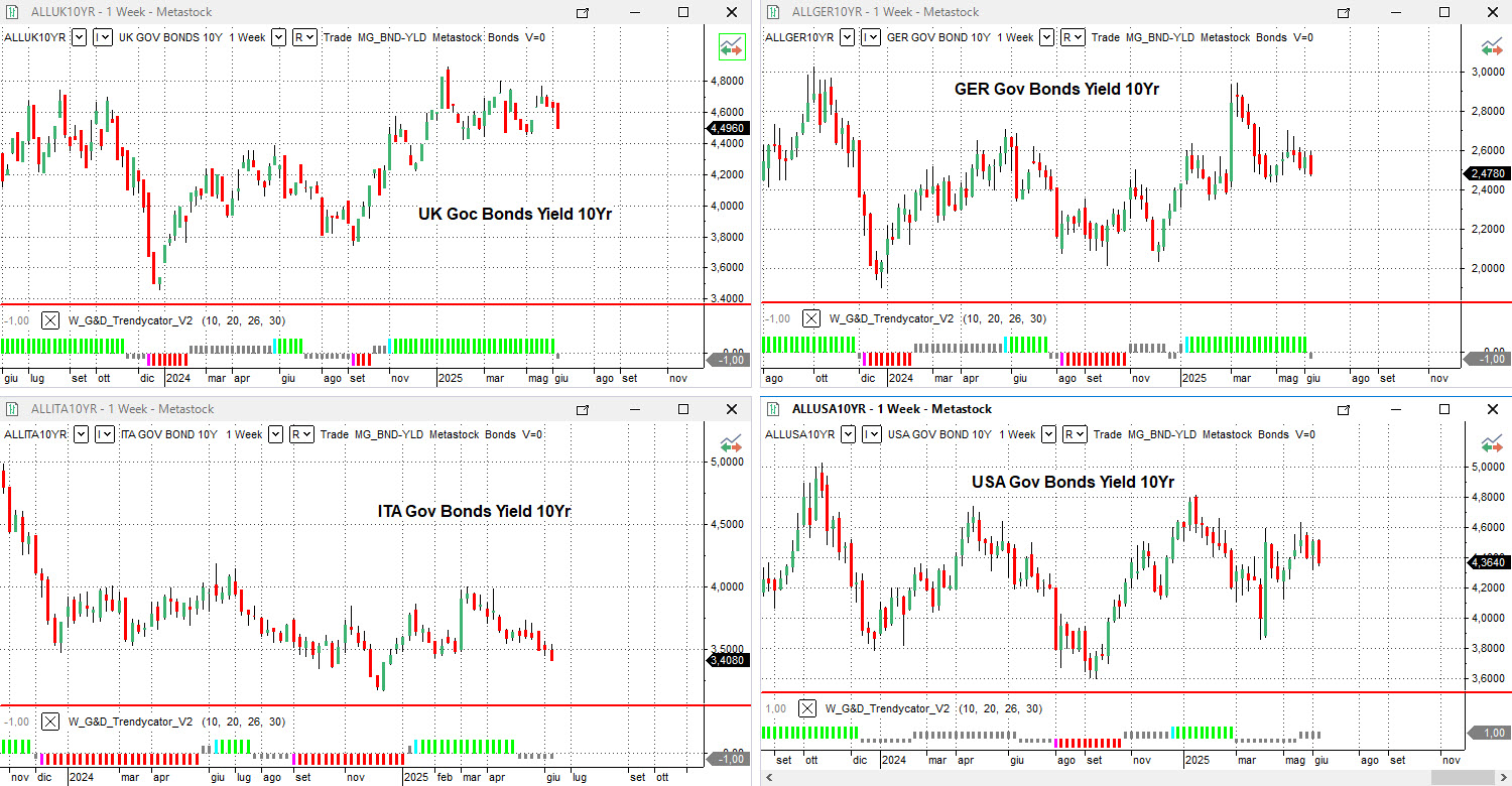 Nel Regno Unito, il rendimento del Gilt decennale si attesta al 4,49%, in calo rispetto ai livelli di inizio mese. Il Trendycator si posiziona su NEUTRAL, riflettendo l’assenza di direzionalità prevalente. La Bank of England mantiene un atteggiamento cauto, con tassi stabili e prospettive di allentamento monetario ancora rimandate. Il mercato attende conferme sul processo disinflazionistico e sull’evoluzione del contesto macro interno.