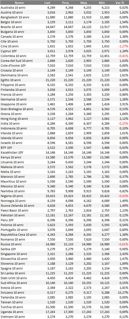 Tabella dei rendimenti, su base settimanale, delle obbligazioni governative mondiali con qualunque rating. Il ranking considera i bond benchmark decennali in tutte le valute di emissione. In alcuni casi, per alcuni emittenti o per alcune valute, il rapporto rischio/rendimento di questi bond può essere anche piuttosto speculativo.