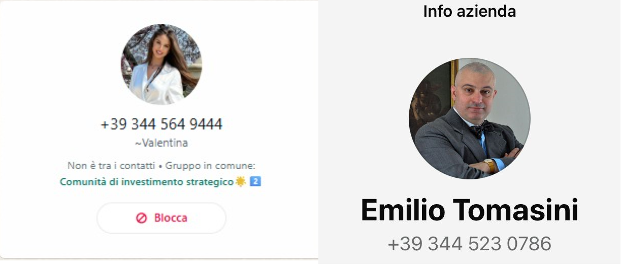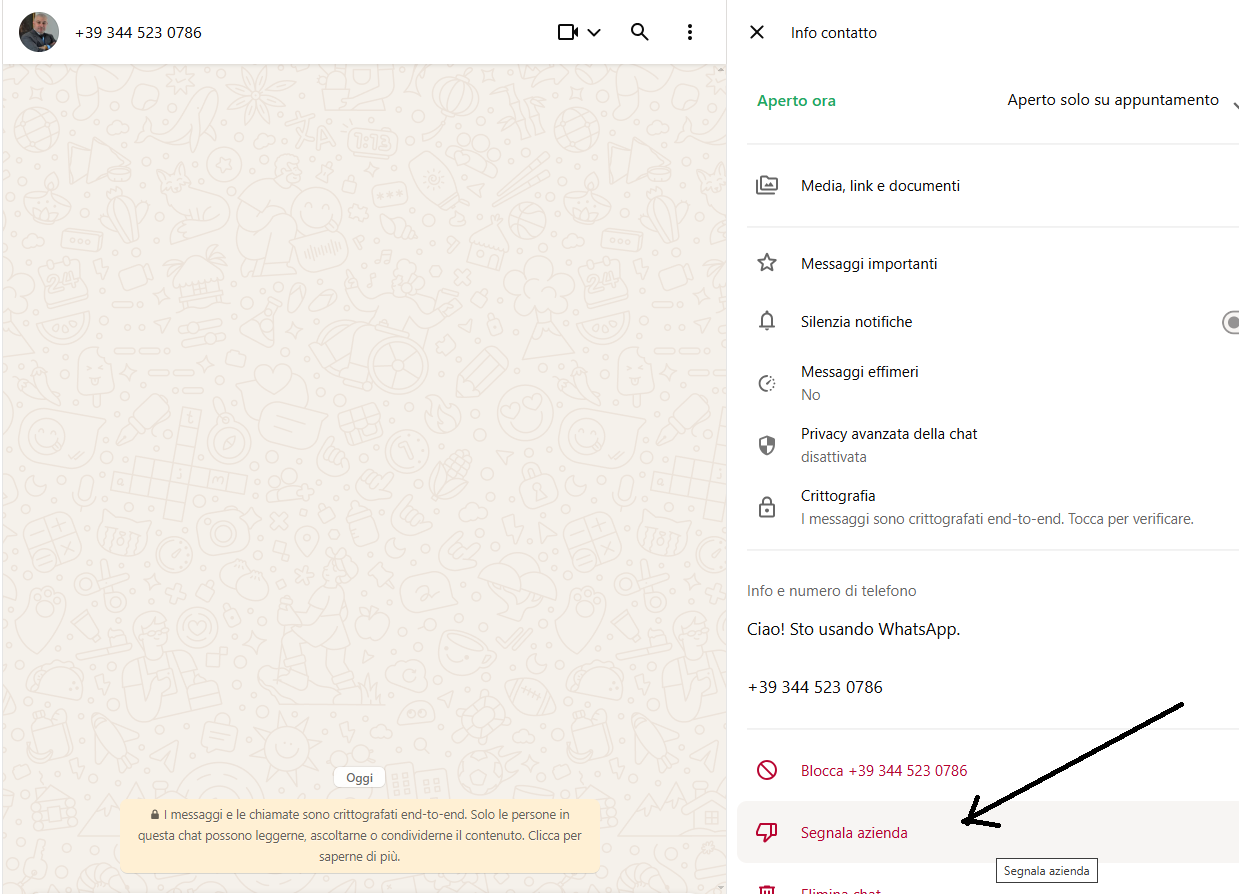 Accanto alla foto profilo e al numero di cellulare fasullo (in questo caso facciamo l'esempio del profilo che si spaccia per Emilio Tomasini, ma la stessa identica cosa andrà fatta per quello che si spaccia per la sua assistente "Valentina"), dopo la lente di ingrandimento trovate 3 pallini, ci cliccate sopra e vi si aprirà una finestra a lato dove in fondo troverete la dicitura "segnala azienda"