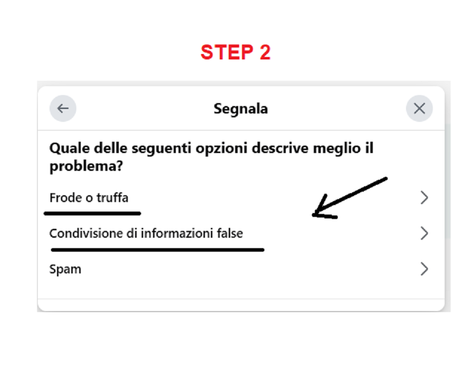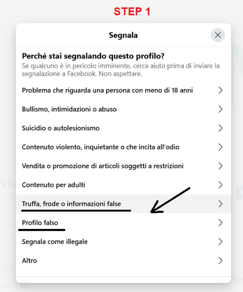 . Step 1: una volta cliccato segnala pagina vi si aprirà la finestra di segnalazione dove potrete cliccare le una tra le due opzioni sottolineate.