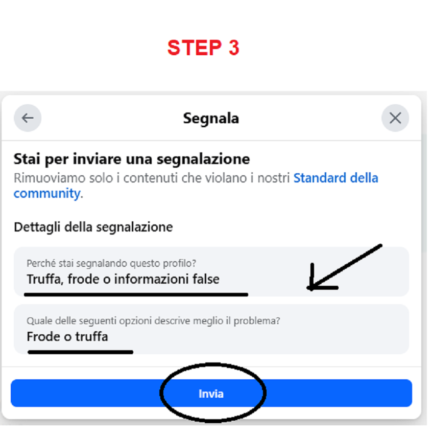 . Step 3: nell'ultimo step scegliete tra le due opzioni sottolineate e premete il tasto invia per segnalare DEFINITIVAMENTE la pagina fraudolenta.
