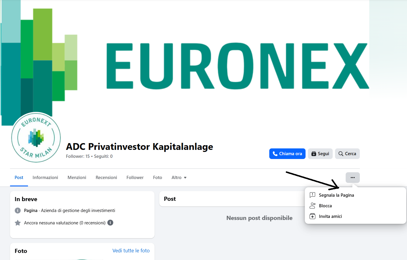 La pagina incriminata che si spaccia per noi è "ADC Privateinvestor Kapitalanlage". E' fondamentale che voi segnaliate questa pagina come truffa, tramite gli step di seguito.