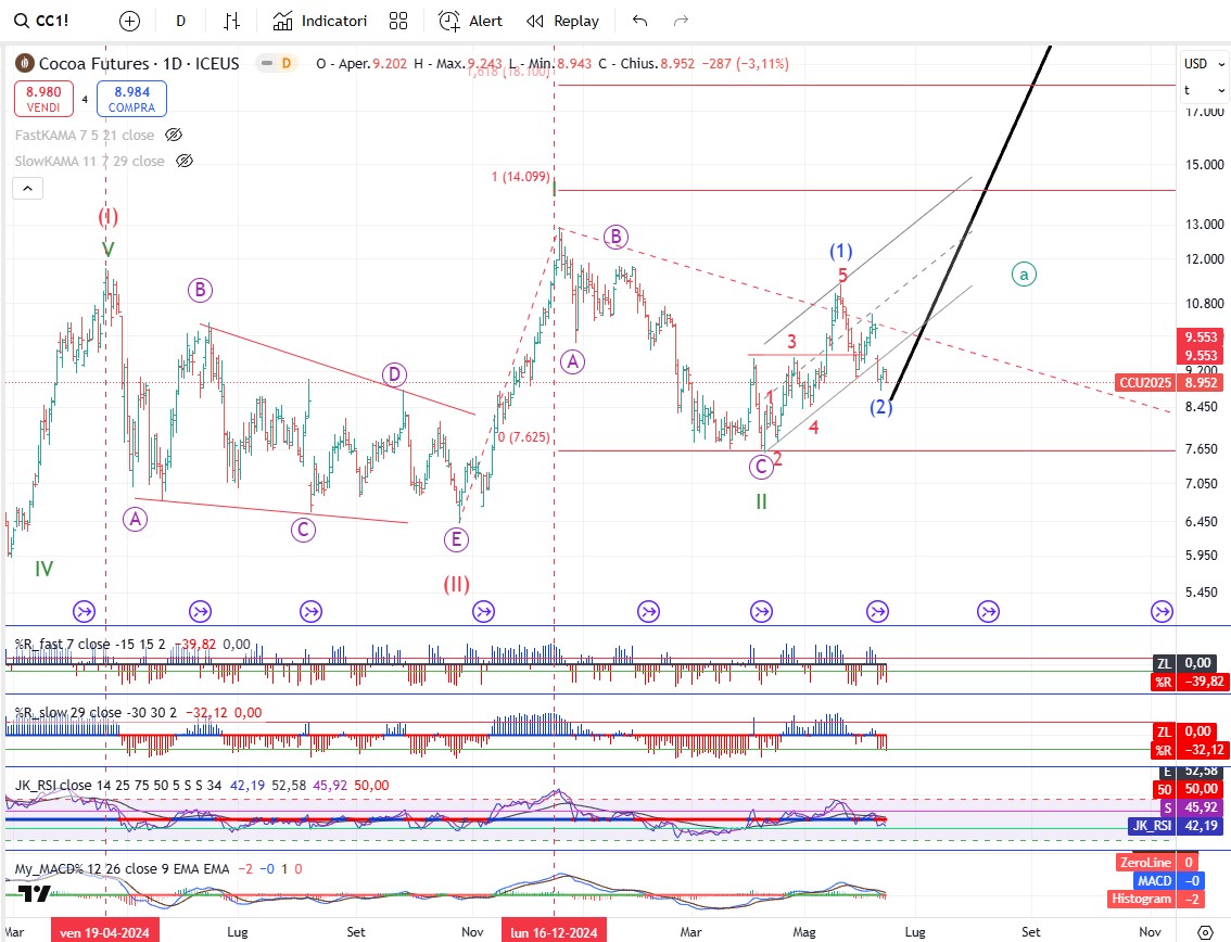 Sul Cacao l’onda 2 dovrebbe essere conclusa o agli sgoccioli. Se è così la prossima settimana i prezzi dovrebbero salire a modellare l’onda 3. Fondamentale per questo scenario la tenuta del minimo di onda II di grado cycle.