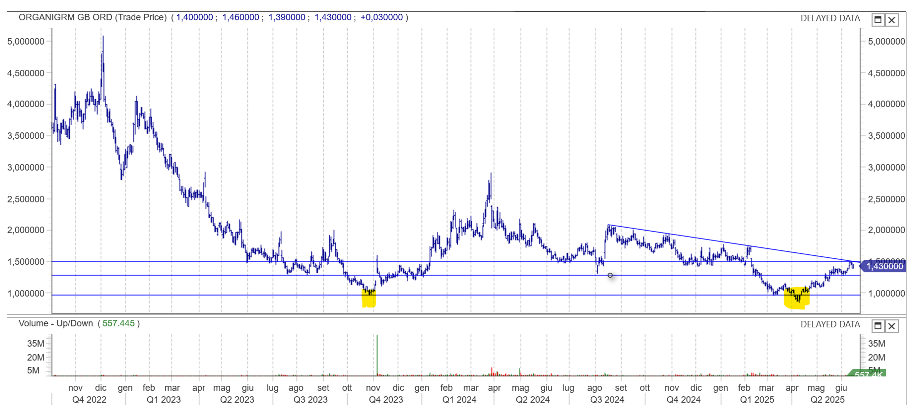 Tecnicamente nel lungo periodo è interessante perche abbiamo visto recentemente la violazione e il recupero del minimo del 2023 che è inbubbiamente un grande segnale “di forza” Attualmente siamo sotto una trend line e una statica a 1,5, e interessante seguire l evoluzione di una eventuale rottura e formazione di figura di continuazione.ù