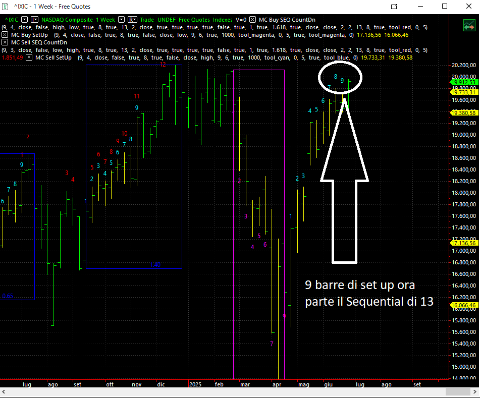 Il Sequential sul Nasdaq composite settimanale ha disegnato un Set Up e ora parte il coundown di 13 barre rialziste ovvero 3 mesi di rialzo. Se me lo aveste detto solo qualche settimana fa non ci avrei creduto ...