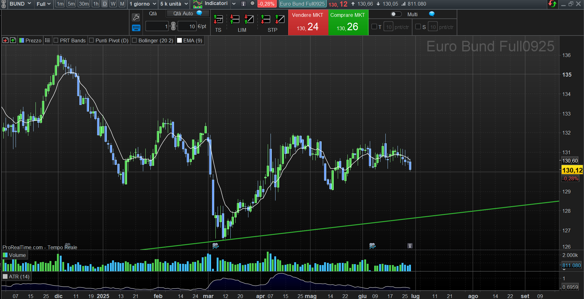 OBBLIGAZIONARIO: Il Bund a 129,8 è una linea nella sabbia. Una rottura spingerebbe i rendimenti verso livelli penalizzanti per i debitori sovrani.