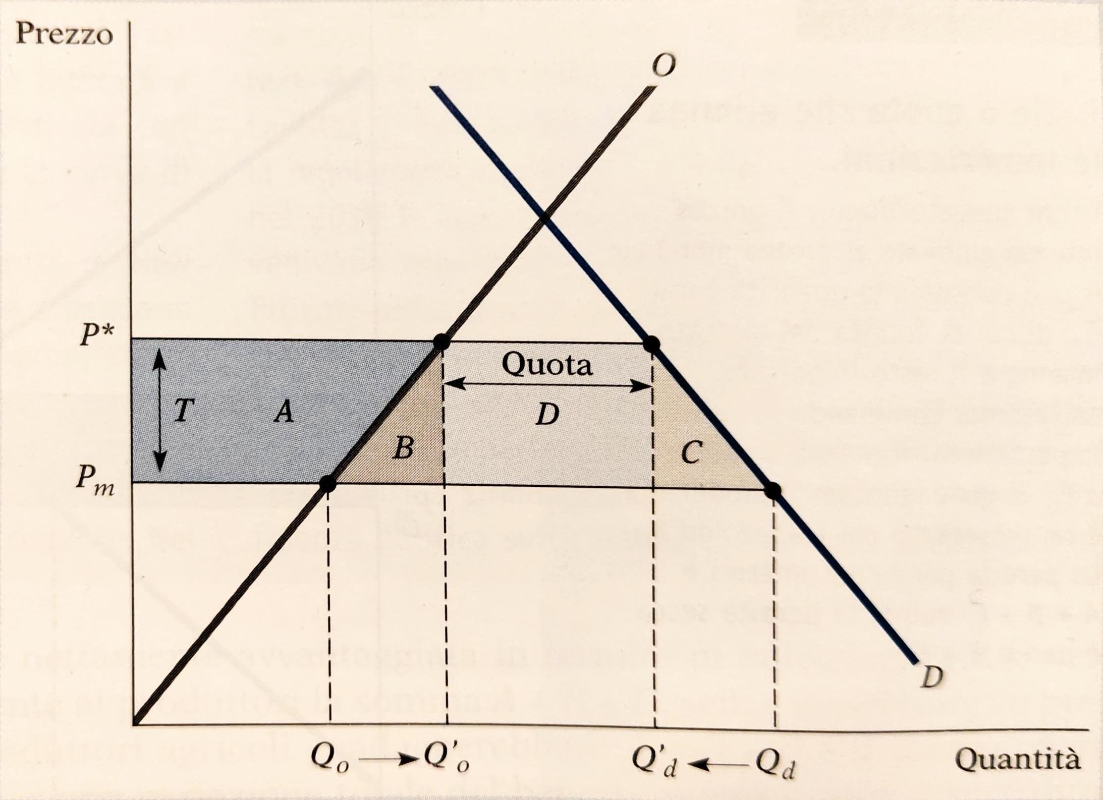 · Il trapezio A rappresenta il guadagno per i produttori interni, che vendono di più (Qo invece di Q’o) e a un prezzo superiore (P* invece di Pm).