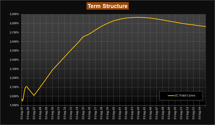 Nel tratto breve (2025–2027), la curva presenta ormai un’inclinazione positiva quasi del tutto stabilizzata. Il residuo nervosismo osservato nei mesi precedenti si è progressivamente ridotto e oggi risulta sostanzialmente ininfluente ai fini dell’interpretazione dello scenario complessivo. La parte iniziale della struttura restituisce un’immagine di mercato che ha assorbito le attese più critiche e che ora guarda con maggiore equilibrio alla traiettoria dei tassi ufficiali.