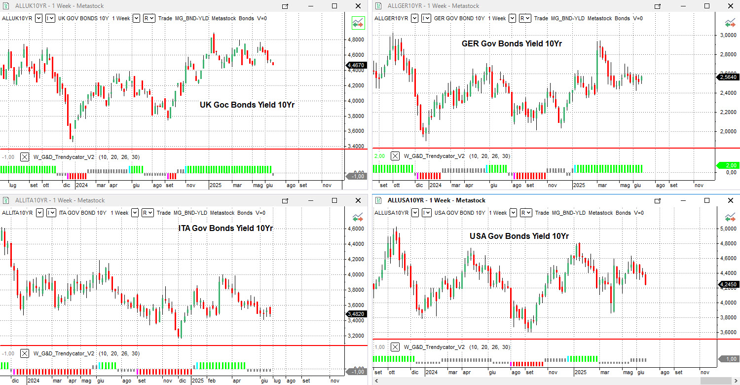 Negli Stati Uniti, il Treasury decennale prosegue la sua discesa controllata, attestandosi al 4,25%. Il Trendycator rimane su NEUTRAL, confermando un’impostazione ancora attendista. La Fed continua a prendere tempo, osservando con attenzione le dinamiche di inflazione e crescita prima di operare eventuali tagli. In questo contesto, l’obbligazionario statunitense appare in fase di consolidamento, con volatilità contenuta lungo la curva.