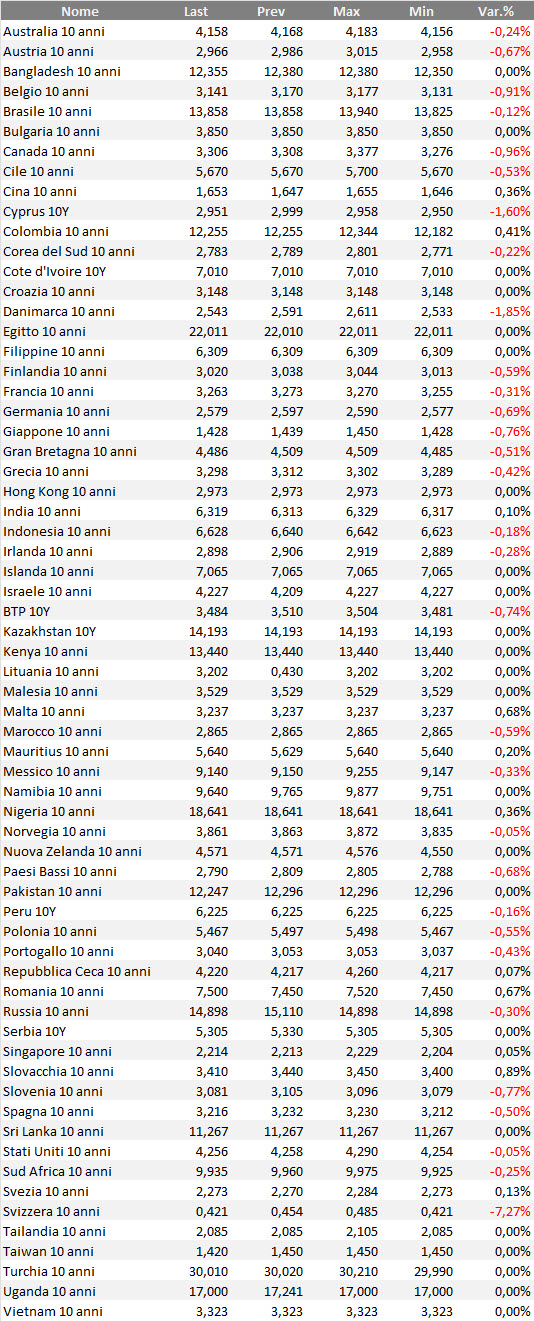 Tabella dei rendimenti, su base settimanale, delle obbligazioni governative mondiali con qualunque rating. Il ranking considera i bond benchmark decennali in tutte le valute di emissione. In alcuni casi, per alcuni emittenti o per alcune valute, il rapporto rischio/rendimento di questi bond può essere anche piuttosto speculativo.