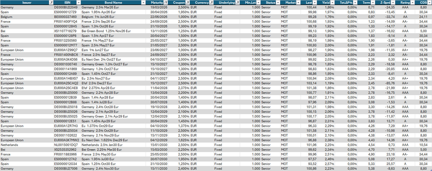 Qui sotto, a titolo di esempio una selezione di governativi e sovranazionali con scadenze dal 2026 al 2030, per una strategia laddering da affiancare o integrare in portafogli già posizionati su Btp, in modo da diversificare gli emittenti.