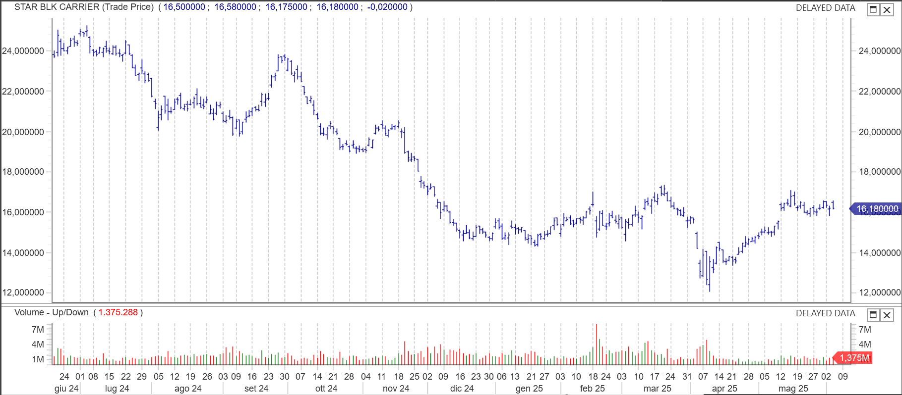 Le società che avevamo visionato diverse settimane fa hanno evoluzioni diverse. SBLK la piu grande come capitalizzazzione è “salicchiata” ma ha scarso appeal, volumi bassi e altre caratteristiche che la lasciano nel dimenticatoio,attendere evoluzioni piu chiare, SHIP è quella che ha performato di piu da metà maggio ma ha un rialzo travagliato che non la rende appetitosa.