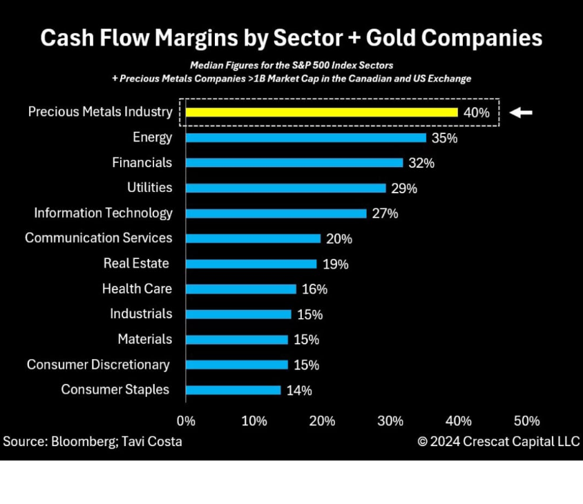 Già a settembre Bloomberg pubblicava questa tabella dove si metteva in risalto come i miners fossero il settore che presentava unCash Flow Margin pazzesco,visto il rialzo del prezzo dei preziozi, ma i titoli erano particolarmente deboli salvo casi rari, mentre adesso i titoli del settore hanno cambiato DNA.