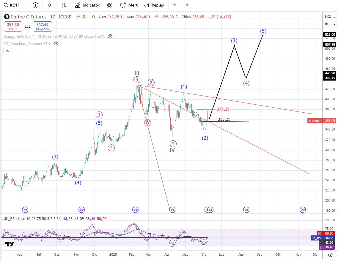 Sul grano l’onda 2 sembra evolvere in un modello flat per cui dovremmo avere un’onda C al ribasso che riporti i prezzi sotto al minimo di onda A. Dopo l’onda 3 dovrebbe dispiegarsi in tutto il suo splendore.