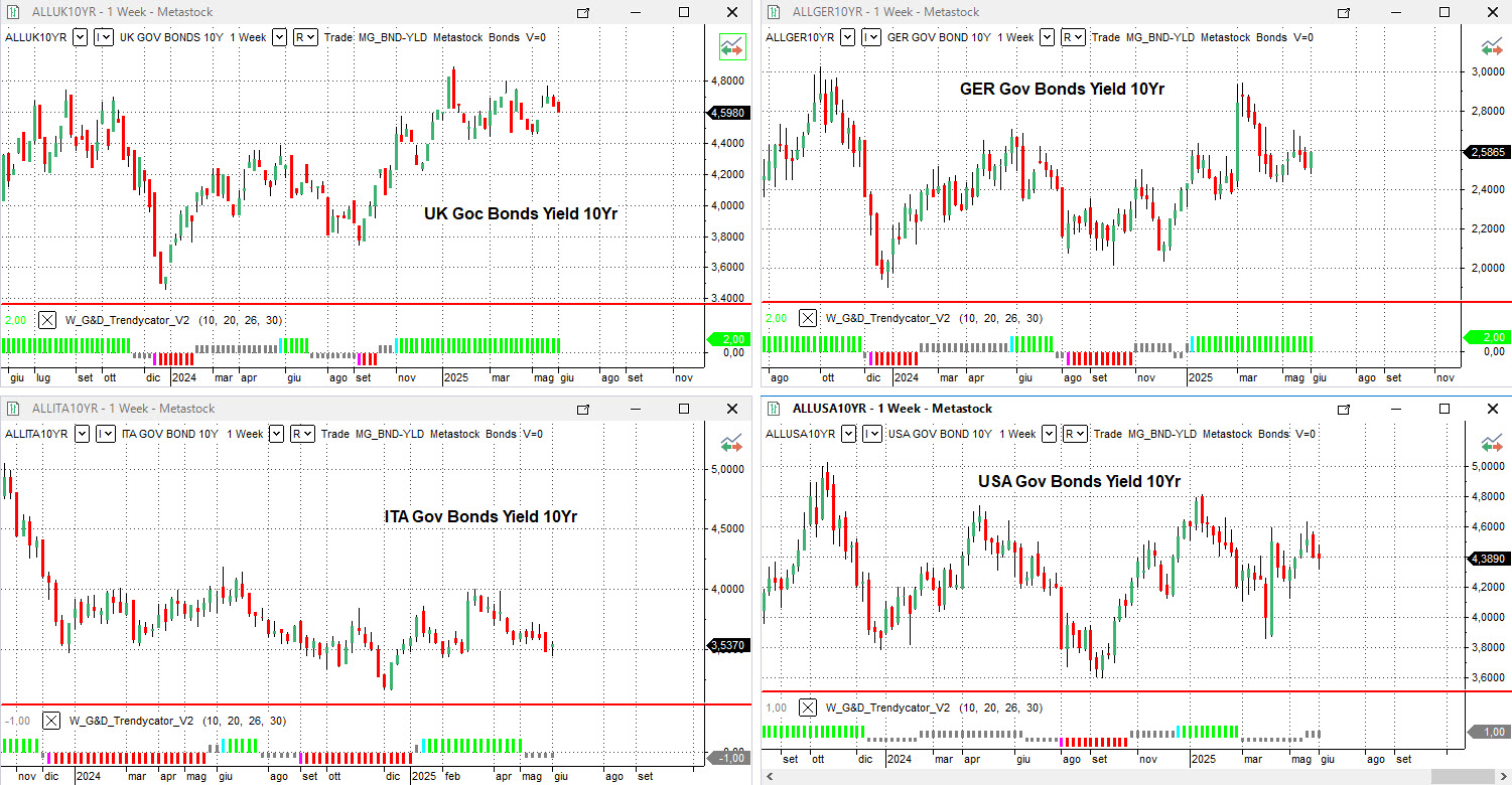 In Germania, il rendimento del Bund decennale risale leggermente al 2,58%. Il segnale LONG del Trendycator viene confermato, a indicare una fiducia di fondo nella stabilità macroeconomica dell’area core, rafforzata dalla chiarezza strategica mostrata dalla BCE nell’ultima riunione. L’asset tedesco continua a rappresentare un punto di riferimento stabile, senza eccessi di volatilità lungo la curva.